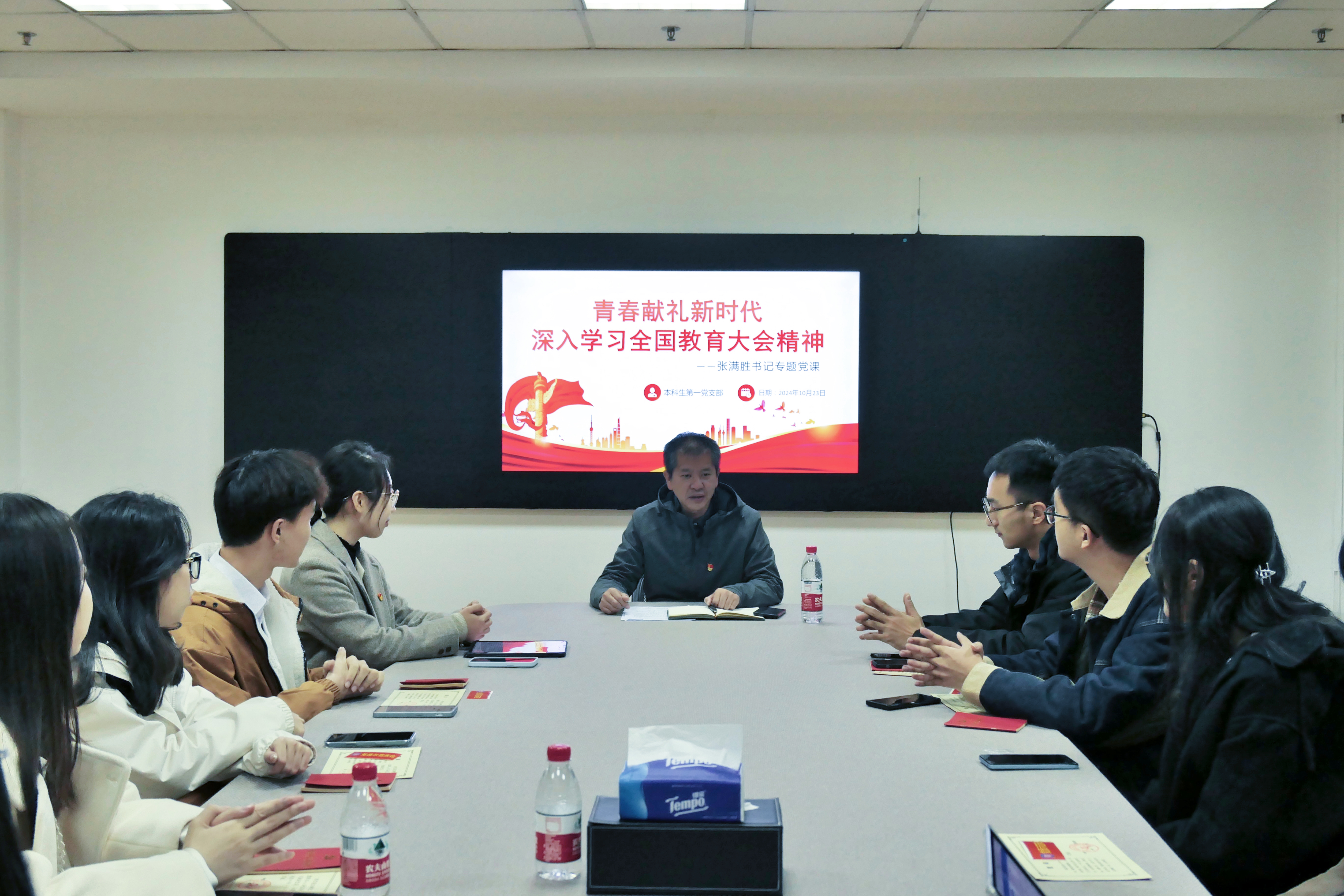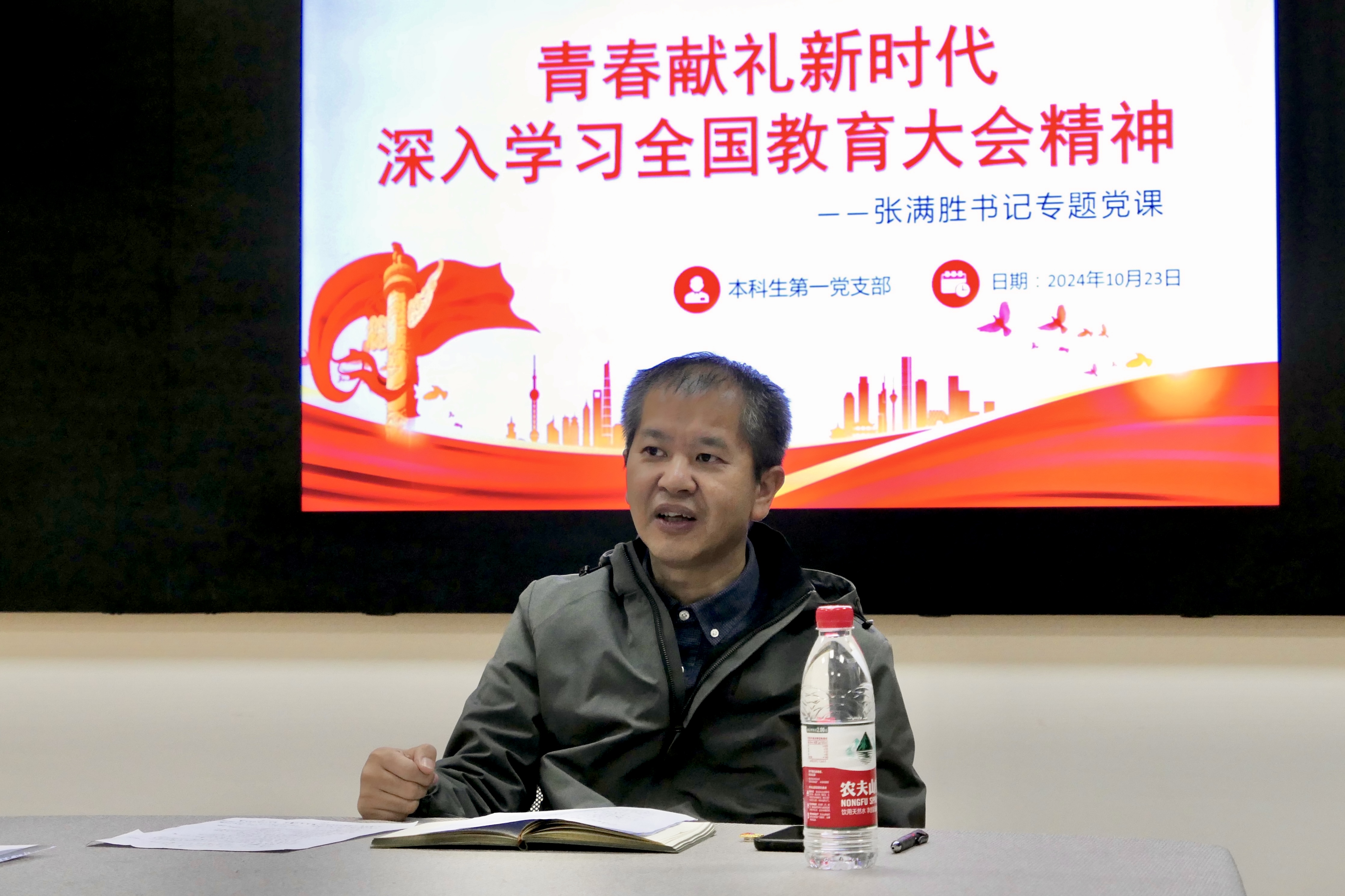 10月23日19时,色情视频 本科生第一党支部10月主题党日“青春献礼新时代,深入学习全国教育大会精神”于综合楼1114室举行,本科生第一党支部邀请色情视频 党委书记张满胜,为支部全体学生党员讲授专题党课,带领全体党员深入学习习近平总书记在全国教育大会上的重要讲话。