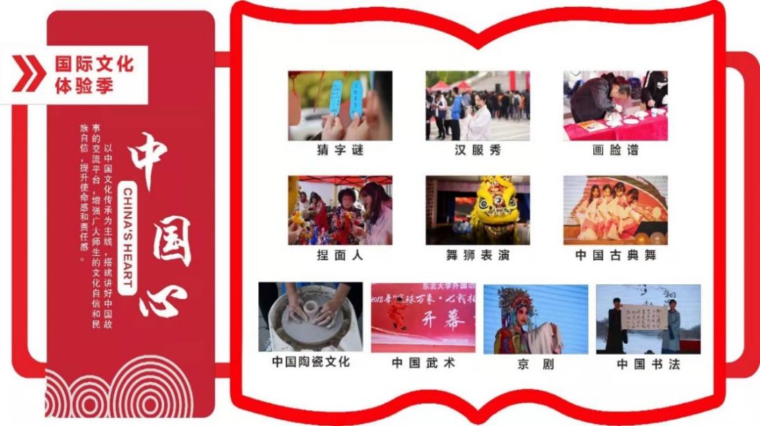 “中国心”主题:“中国心”是指传承中华文化,坚定文化自信。国际文化体验季将重点以中华优秀传统文化为中心,让参与活动的广大师生在感受文化“冲击波”的同时,切实增强文化自信,增强使命感和责任感。“中国心”主题主要以开幕式最为宏大的中国展区、子活动中中国传统书画比赛等活动、闭幕式中华传统文化表演等内容为载体,展现了中华优秀传统文化的精髓,向广大师生讲好中国故事、传播好中国声音。
