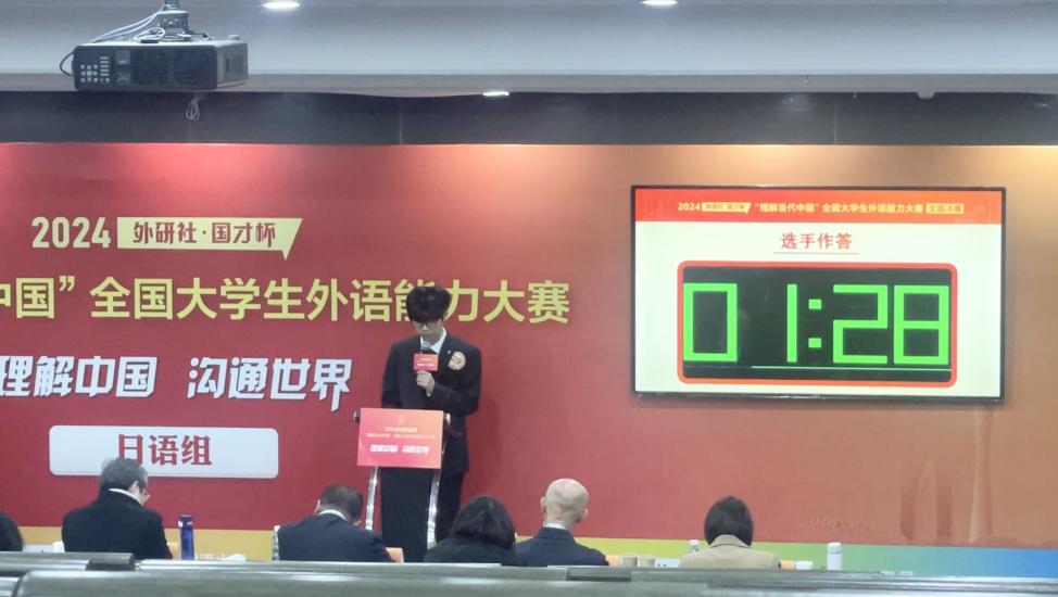 决赛阶段主要考察口译和演讲能力,要求参赛者不仅具备扎实的语言基础,还必须深入理解中国的发展逻辑与改革成就。这对选手的语言综合运用能力、跨文化思辨能力以及创新能力提出了极高的要求。戴豪杰同学在赛前进行了充分的准备,在国蕊、林荫老师的指导下,在比赛中发挥出色,首次参赛便取得了突破性的成绩,充分展示了我校日语系学生优秀的专业实力和积极向上的精神风貌。