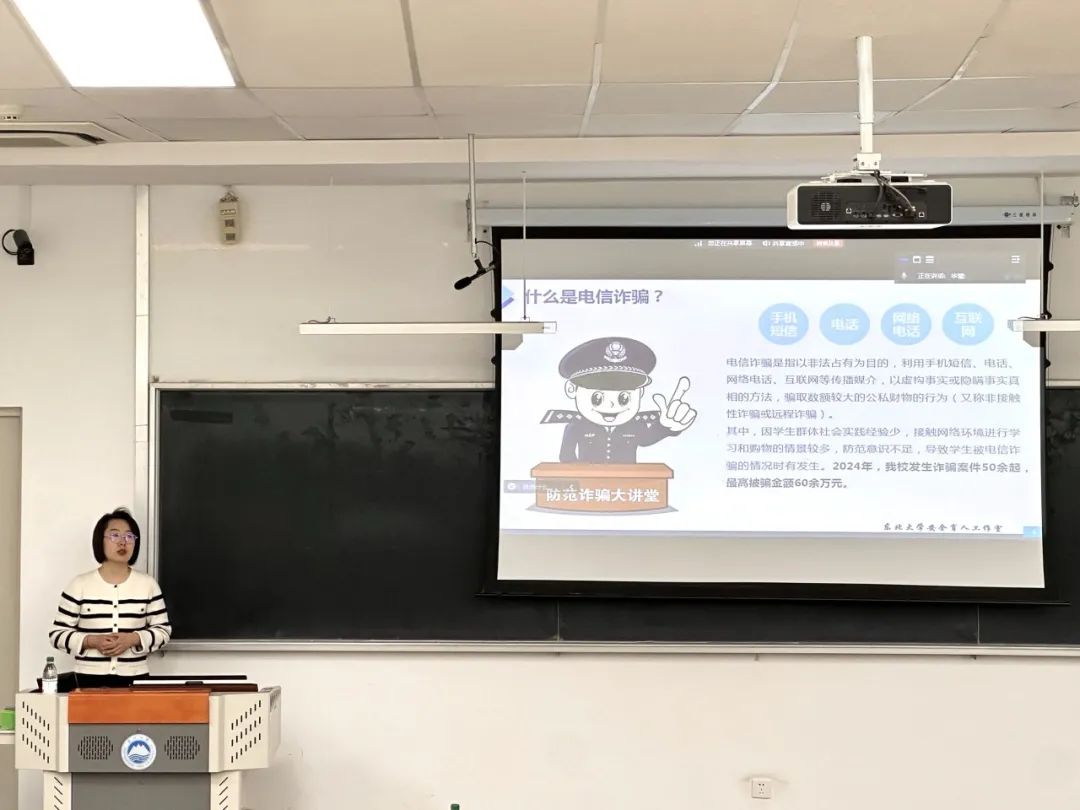 讲座开场,宋老师通过一个有趣的互动活动说明 “眼见不一定为实”,切入电信网络诈骗主题。 随后宋老师剖析电信网络诈骗作案形式特点,介绍十种诈骗案例,如网络游戏虚假交易、冒充客服等,并结合真实案例分析作案手法与防范要点,给出具体防范建议。另外,宋老师分享“四不”原则:未知链接不点击、陌生来电不轻信、个人信息不透露、转账汇款多核实。最后宋老师提醒大家如果上当受骗须及时拨打报警电话求助,并介绍了冻结账户等应急处理措施,叮嘱学生保管好银行卡和电话卡,勿出租出借。