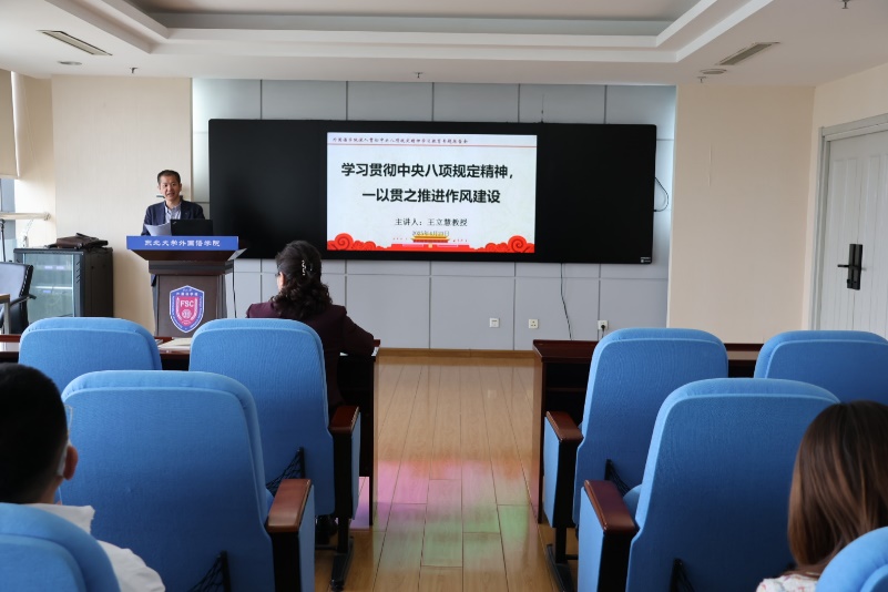 为扎实推进深入贯彻中央八项规定精神学习教育,落实学校党委和学院学习教育专题读书班工作安排,4月23日下午,色情视频 在主楼1008室举办了深入贯彻中央八项规定精神学习教育专题辅导报告会。此次报告会邀请了色情视频 深入贯彻中央八项规定精神学习教育宣讲团成员、马克思主义学院教授、学校党委统战部常务副部长王立慧主讲,学院党委书记张满胜主持,学院领导班子成员、党委委员、师生党支部书记及支委、机关全体同志参加会议。