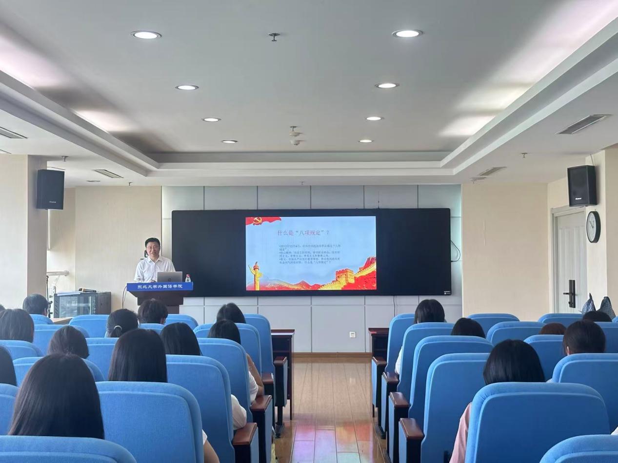 首先,韩老师讲解了八项规定内容及精神核心。其次,韩老师讲解了进行廉洁教育的原因、理论基础及新时代背景下廉洁教育的社会意义等。最后,他通过鲜活生动的案例叮嘱学生党员坚持廉洁自律,严守纪律规矩,在生活中做好监督与自我监督。