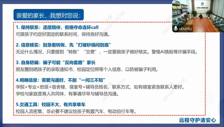 活动特邀沈阳市公安局经济文化保卫支队科长柳勇警官作校园安全专题讲座。柳勇围绕人身安全、财产安全、网络安全三大主题,结合真实案例剖析当前研究生群体面临的安全风险,提醒家长在孩子研究生阶段仍需保持密切关注,通过积极沟通及时掌握孩子各方面的安全情况,及时干预,并主动加强与学校的联系,共同防范潜在的安全隐患。
